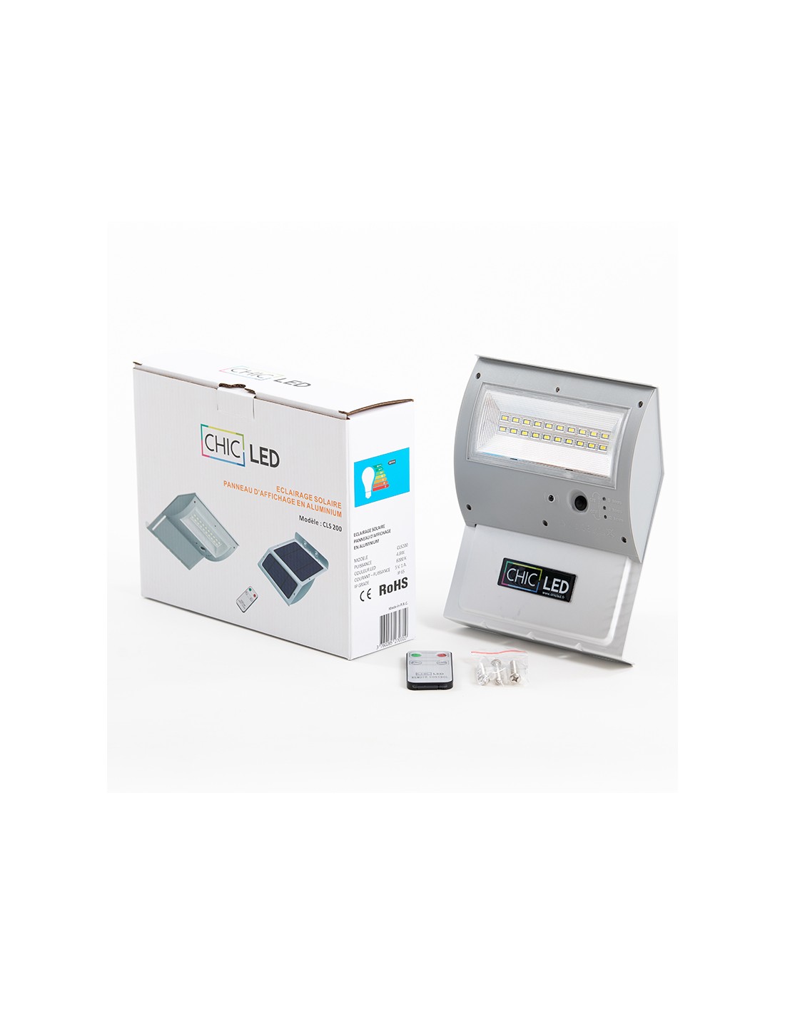 Découvrez le Spot Solaire CHICLED, un projecteur extérieur LED solaire équipé d'un panneau solaire haute performance de 4.8 Watts intégré à la lampe, d'une batterie LiFeP04 de 4500mAh , et de 20 LEDs de 5W à longue durée de vie.